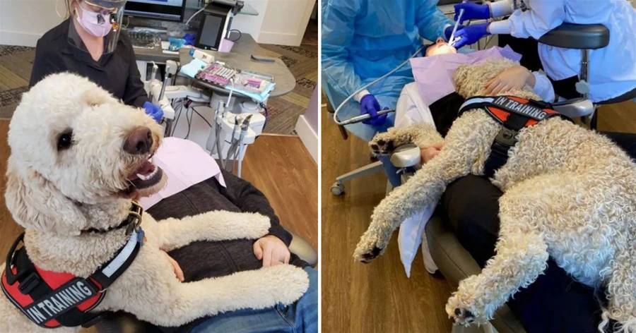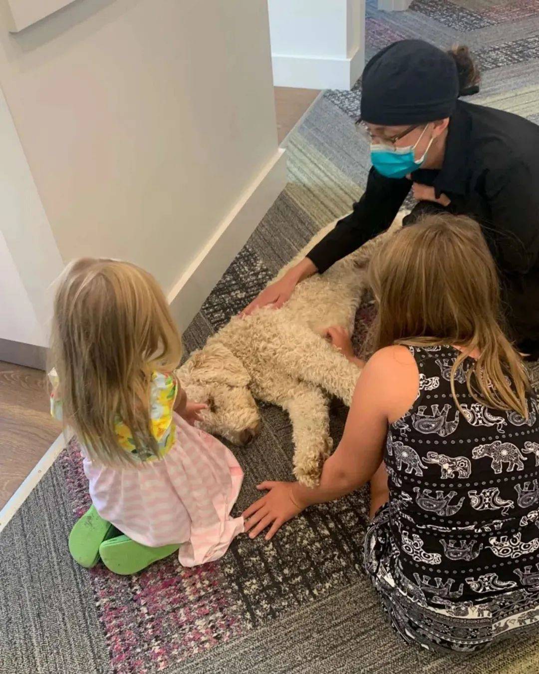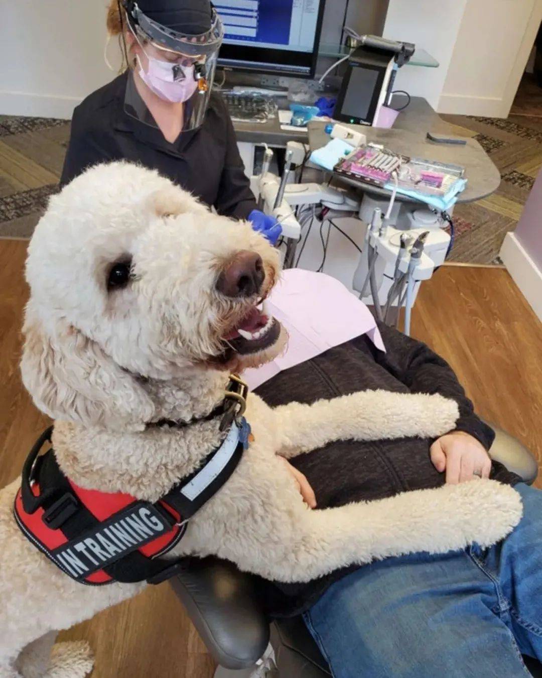 沒錯,這是一位狗狗醫生,Dwight是拉布拉多貴賓犬。別看它才1歲多,但從12周大時,就開始接受治療犬的訓練了。它的訓練師都稱贊它是天生的治愈犬,它非常活潑可愛,在它眼中,并沒有陌生人的概念,它會親近所有人類。每當患者走進診所,Dwight的工作就開始了,它會很熱情的迎上去,滿臉微笑的搖著尾巴。從一開始就默默瓦解患者緊張的情緒,如果患者需要額外的幫助,也可以請Dwight在治療過程中陪同。