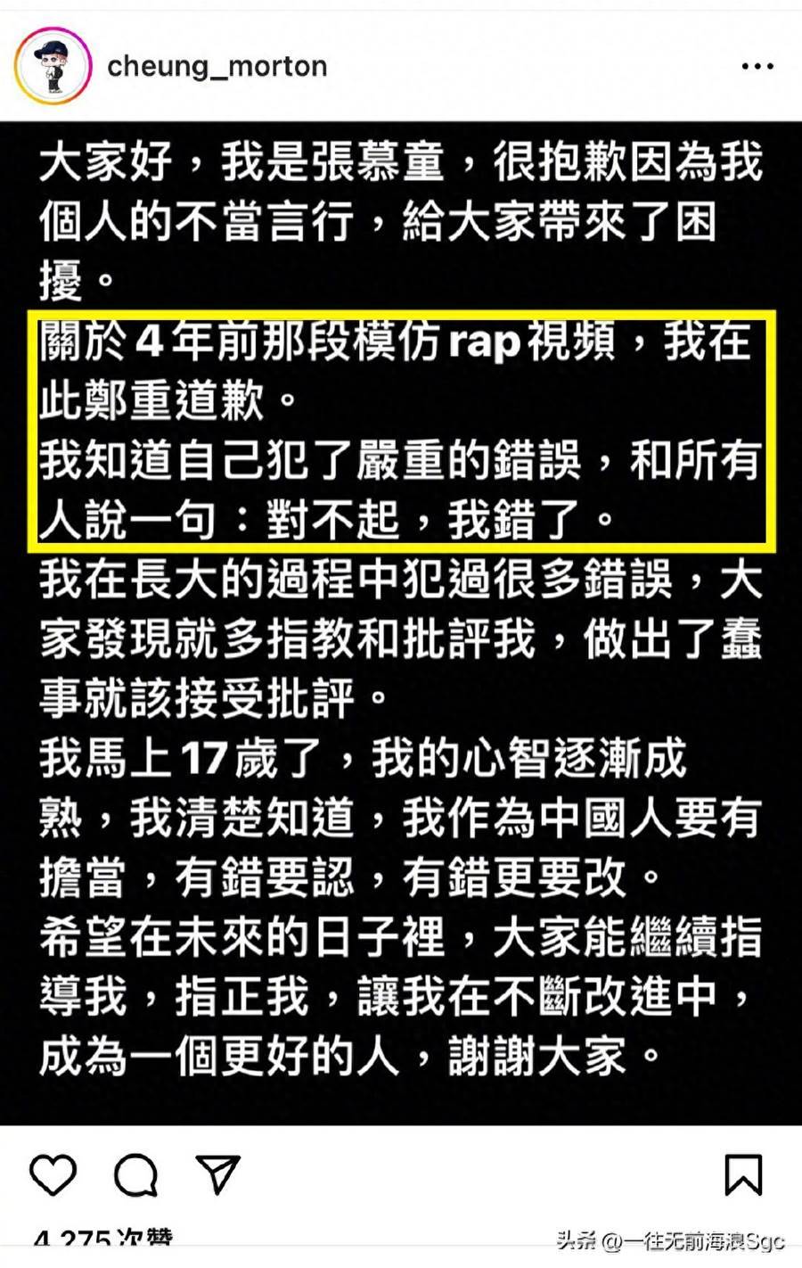 在持續發酵幾天后,張慕童于26日深夜在ins上道歉——