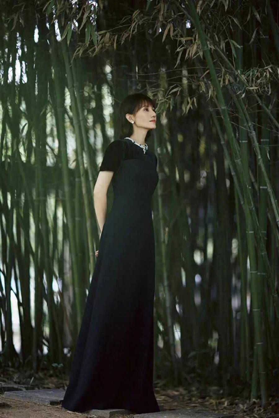 袁泉身著的那件黑色長裙,看似普通,卻盡顯她的獨特氣質。裙子的布料光滑如絲,貼身地包裹著她的身材,凸顯出完美的線條。裙擺輕輕擺動,與周圍的竹葉相互映襯,仿佛是一幅生動的畫卷。