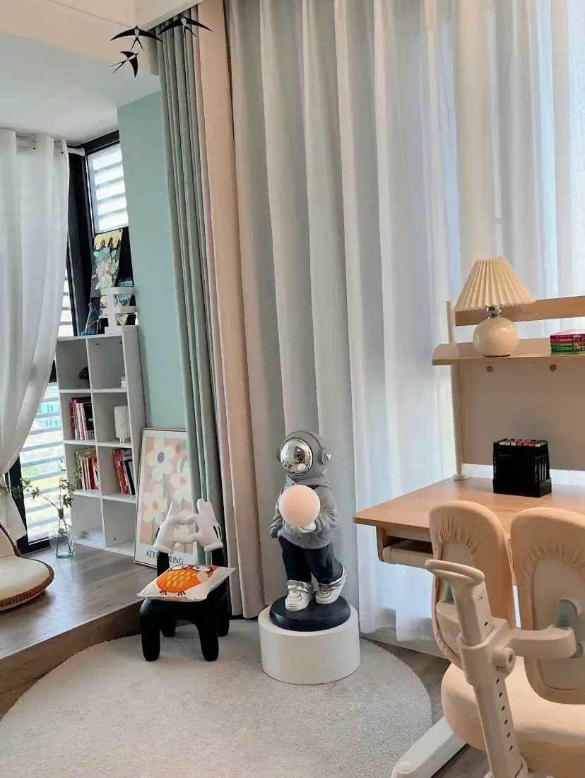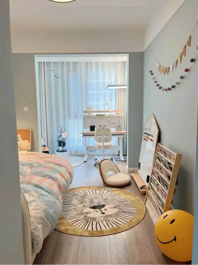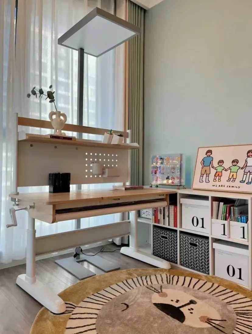 陽台作為屋內光線最好的地方,做學習區是最合適的。用升降學習桌+斗柜的組合方式來做L型半包圍學習區,斗柜可以滿足日常的書籍和衣物的收納需求,書桌可以自由調節高度用到高中都沒問題。