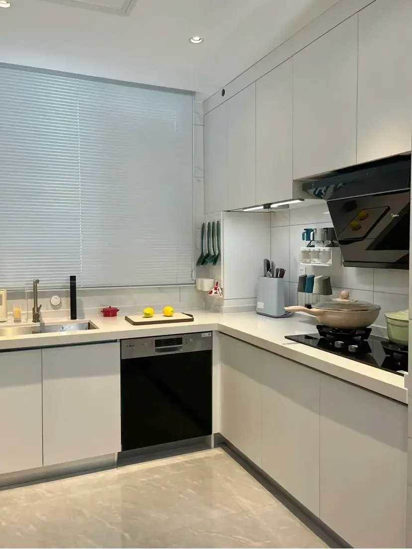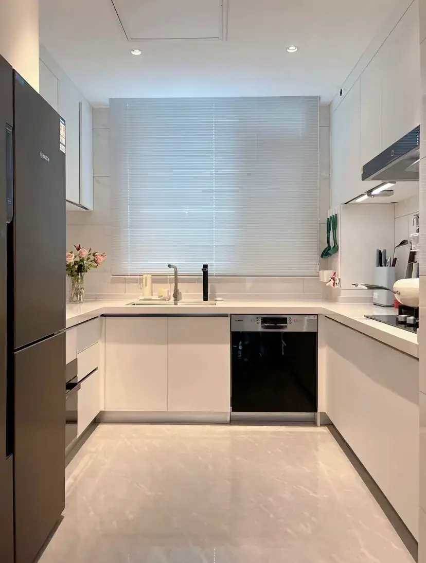 地面和餐廳通鋪的淺灰色地磚,墻面橫貼白色花紋磚,頂面用防水石膏板吊頂➕內嵌式射燈,櫥柜用雙飾面門板➕隱形拉手,經過這麼搭配的小廚房極簡又顯寬敞。