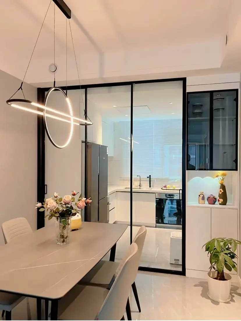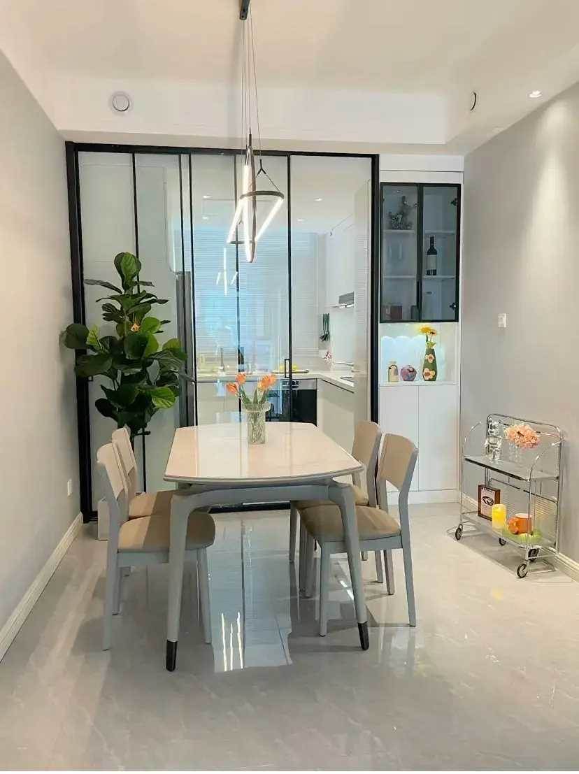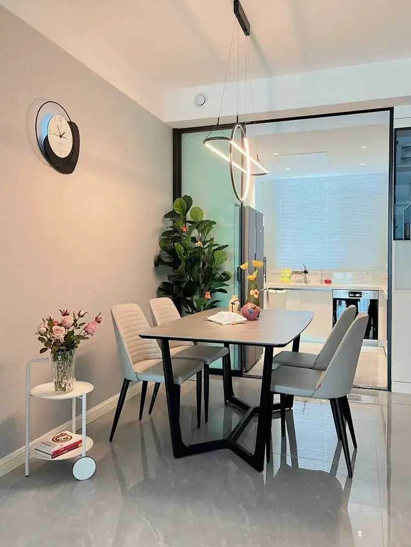 由于客餐廳和廚房是南北通透的,在設計時候就按照同一空間來搭配。地面通鋪的800*800淺灰色地磚,用同色美縫劑來填充磚縫,這樣出來的地面更連貫還顯空間大。