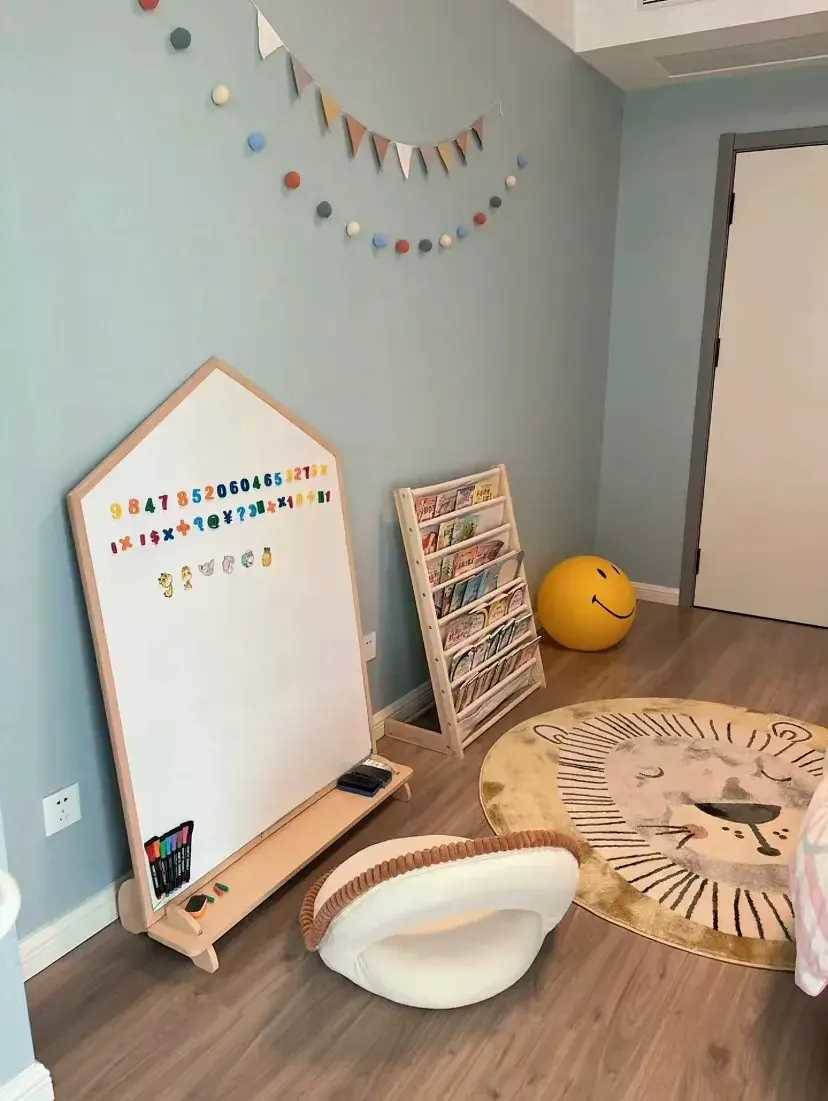 兒童房的硬裝很簡單,床頭墻不做卡通背景,全屋通貼霧藍色壁布。地面鋪木地板,冬天供暖后腳感會好一些,小孩光腳丫跑也不擔心著涼了。