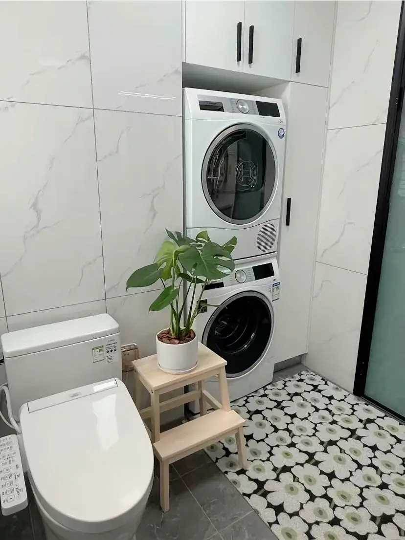 公共衛生間,占用了旁邊房間的一點點空間,在墻面挖出了一個收納洗衣機的收納柜,將洗衣機布置到了衛生間區域,給排水施工簡單,還能讓其他的空間保持最大程度的干凈整潔。