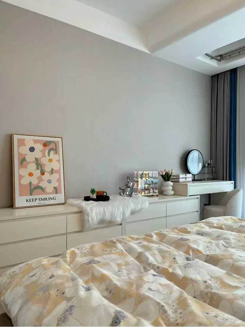 床尾的位置和很多家里的都一樣,布置了靠墻的整排收納柜和梳妝台,只是這里的收納柜更多一些,布置了整整兩組,可以收納更多的物件。