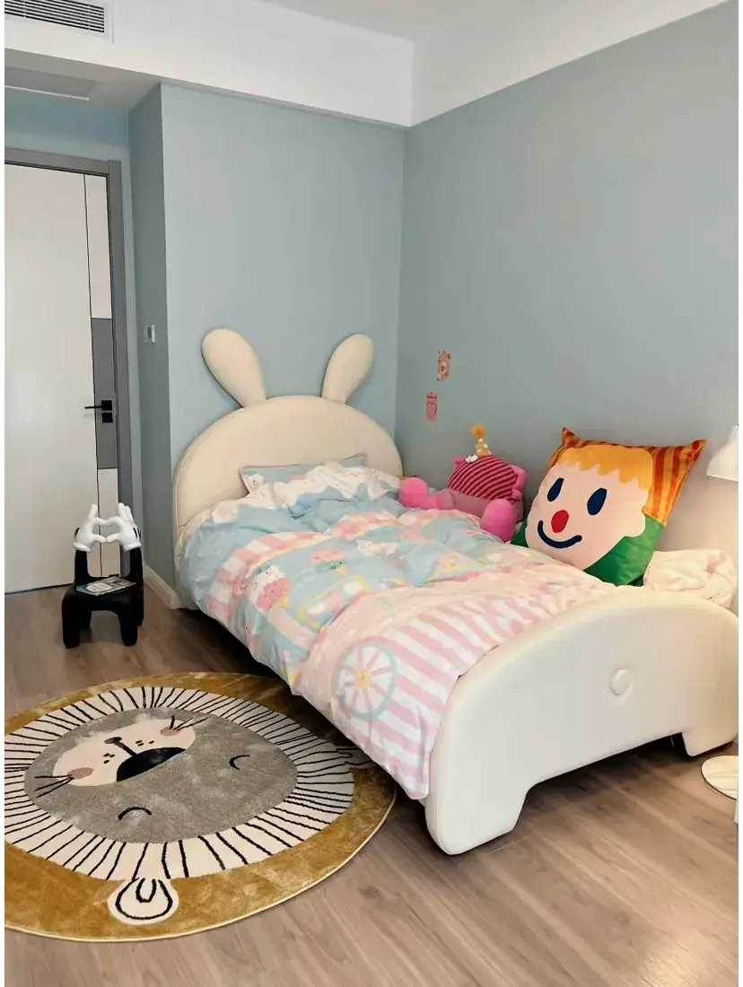 兩面貼墻擺放了1.2米的單人床,卡通兔的床頭寬度和墻面剛好齊平,過道變寬后就有了玩耍的空間。家里的姑娘超級喜歡畫畫,就安排了塊繪板來讓她實現繪畫自由。