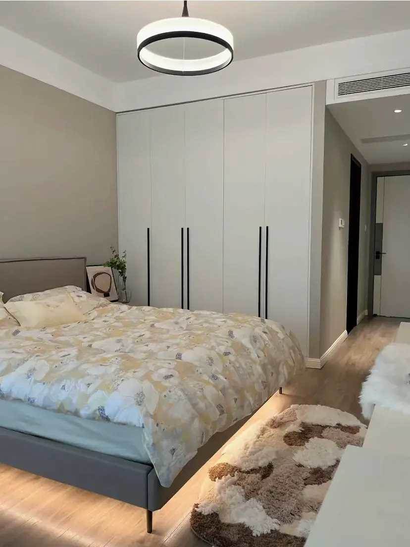 墻面都沒有做造型,統一貼了淺灰色的花紋壁布,灰色也是能營造出溫馨感的,就看是怎麼樣的去搭配,比如壁布的材質比較溫馨一些,比如增加了暖色的燈光。