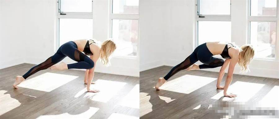 斜板式進入,胸腔向上推高 呼氣,收緊核心,屈右膝 向前觸碰右大臂的外側 吸氣,右腿向后,呼氣 右腿屈膝向前觸碰左大臂 動態練習8-10組,換另一側