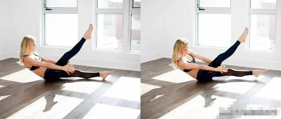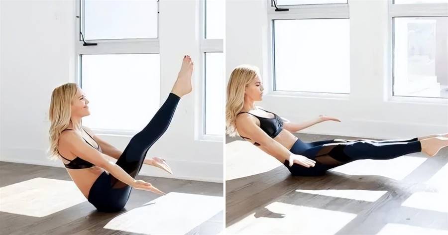 坐姿準備,雙腿并攏伸直 右腿上抬至與地面45度 呼氣收核心,上半身離地 雙手在右大腿后側相觸 吸氣,身體還原到仰臥位 動態練習8-10組,換另一側