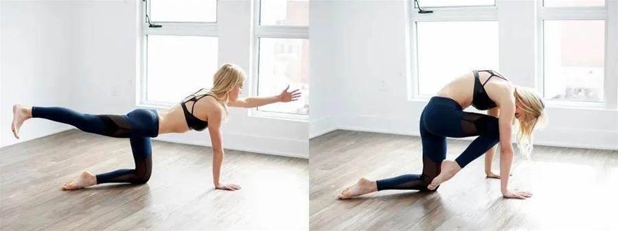 四足跪進入,大腿平行地面 吸氣,右腿向后伸直抬高 至與地面平行,髖部水平 呼氣,屈右膝向前找鼻尖 保持核心收緊,胸腔向上推高 動態練習8-10次,交換另一側