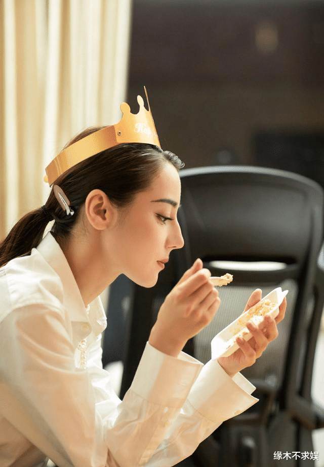 照片中迪麗熱巴身穿法式白襯衫,頸部纏繞著一大串珍珠項鏈。她頭上戴著生日皇冠,手上拿著生日蛋糕,看似在品嘗,實則是在配合拍照。雖然有擺拍的嫌隙,但昏黃的背景配上精致的美人,卻是別有一番意境。
