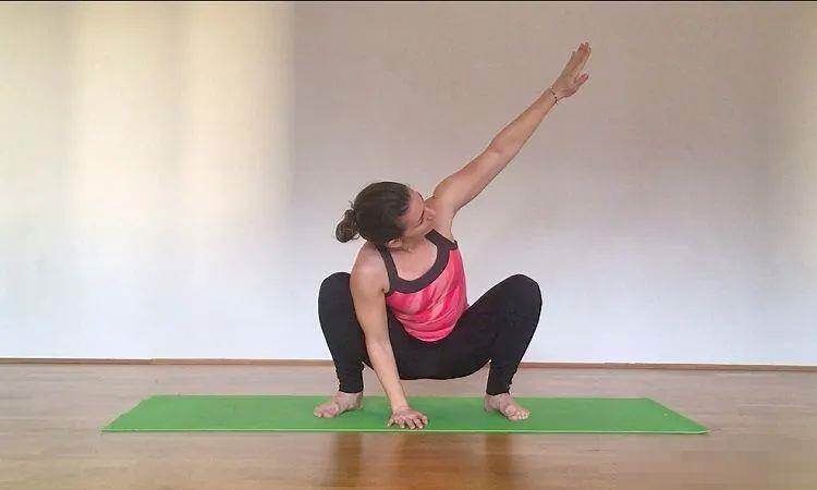 雙腳變寬并下蹲,手臂放在腿內側。伸出右手,指尖壓向地面。抬起左臂,專注于打開胸腔。在這個體式中呼吸五次,然后換邊。