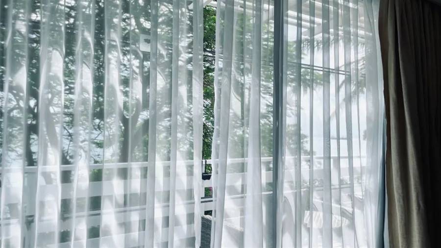 早上起床能看見陽光灑過窗簾,映照在臉上。