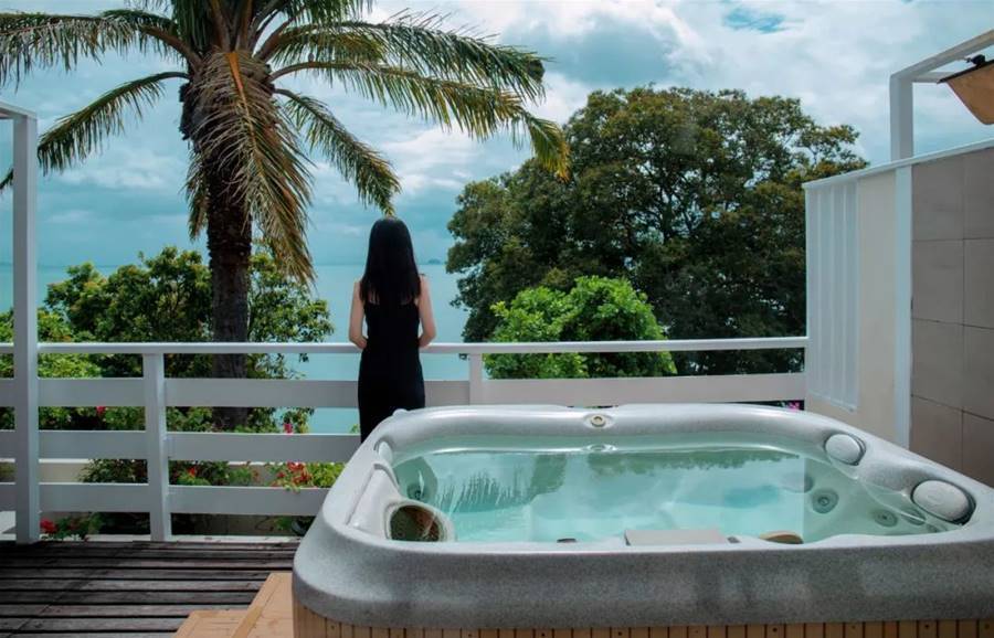 我們預定的是這里的signature corner suit,房間外面就有一個小露台,白色秋千和桌椅,可以遠眺到迷人的棕櫚樹和海洋。
