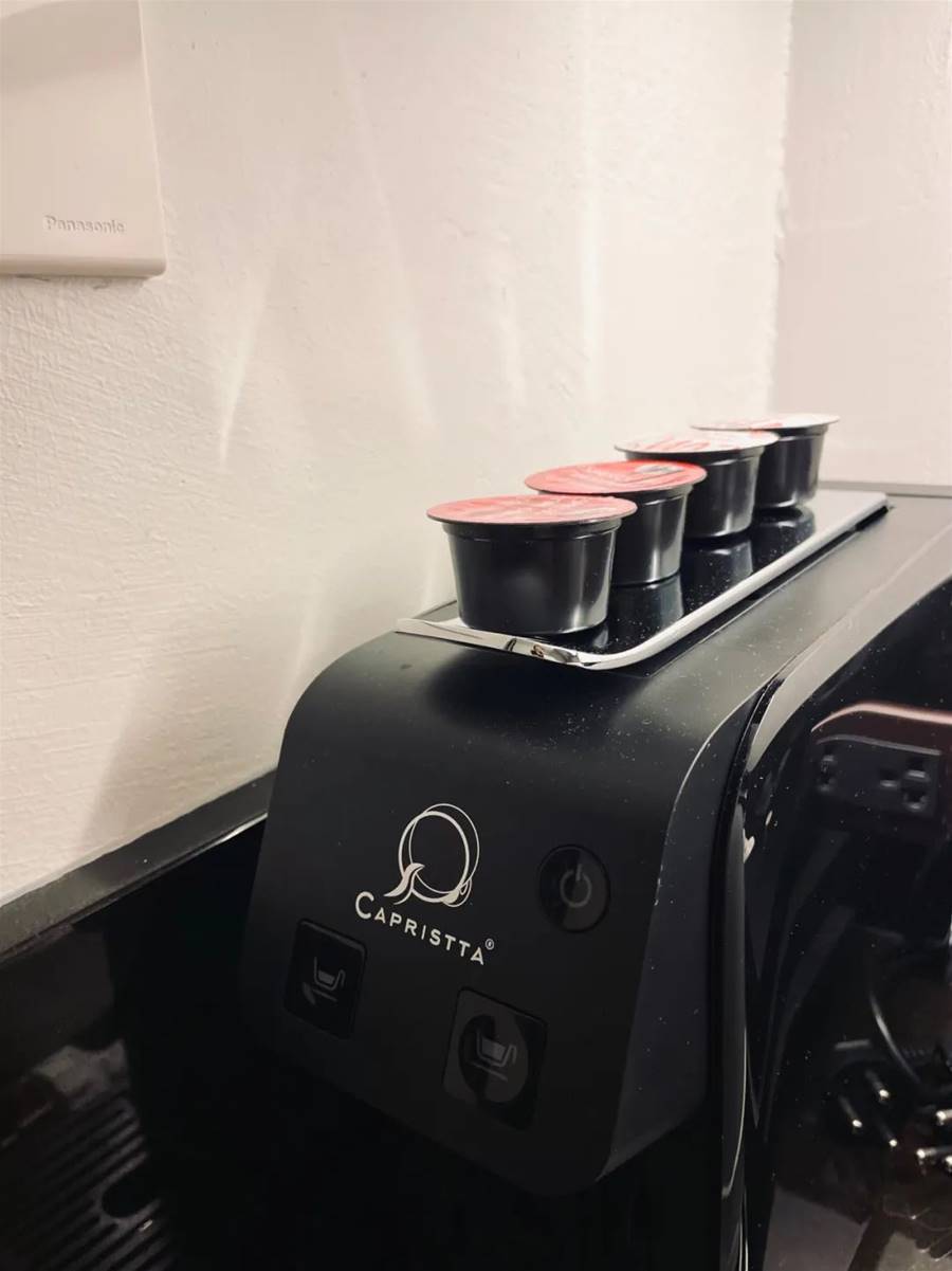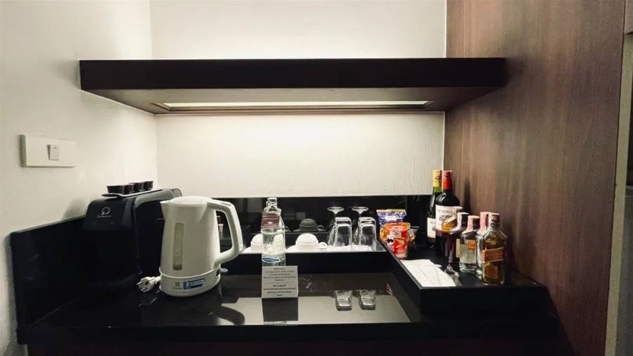 打開房門,豁然開朗。簡單、明凈,值得一提的,是還有兩個衛生間。茶水間豐富且隱蔽,有飲料有茶,有我愛的膠囊咖啡機。
