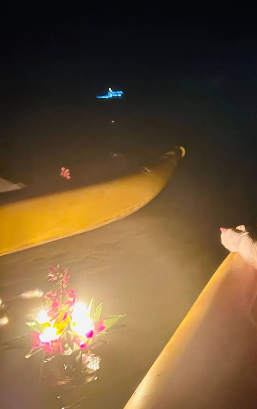隨著水燈放下去,合十許愿的剎那,海里的浮游生物們紛紛涌現,抖動身體,在黑色海面上閃閃發光。