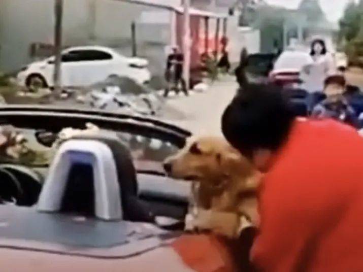 然后死死賴在主人懷里,任誰喊話都不肯離開。主人看著狗狗滿是心酸,可是又沒辦法將它一并帶回家。想著長痛不如短痛,便忍痛含淚將狗狗給哄下了車。