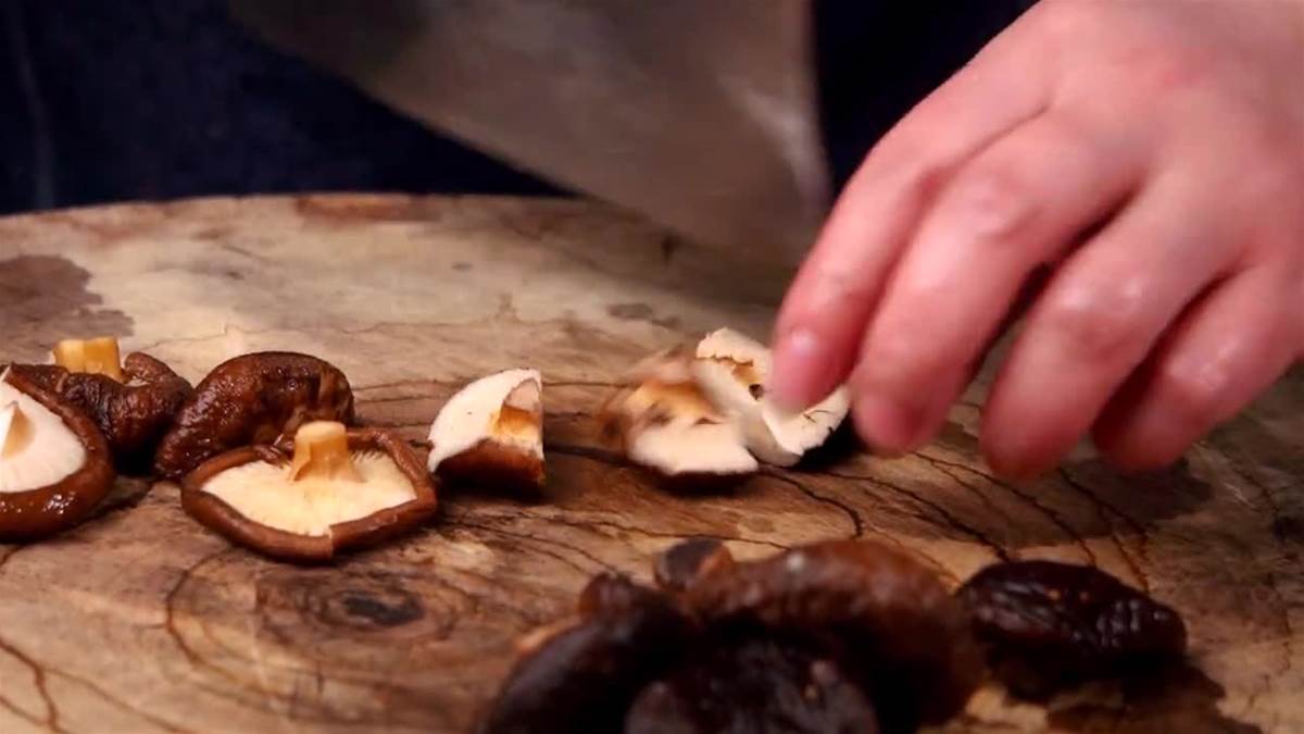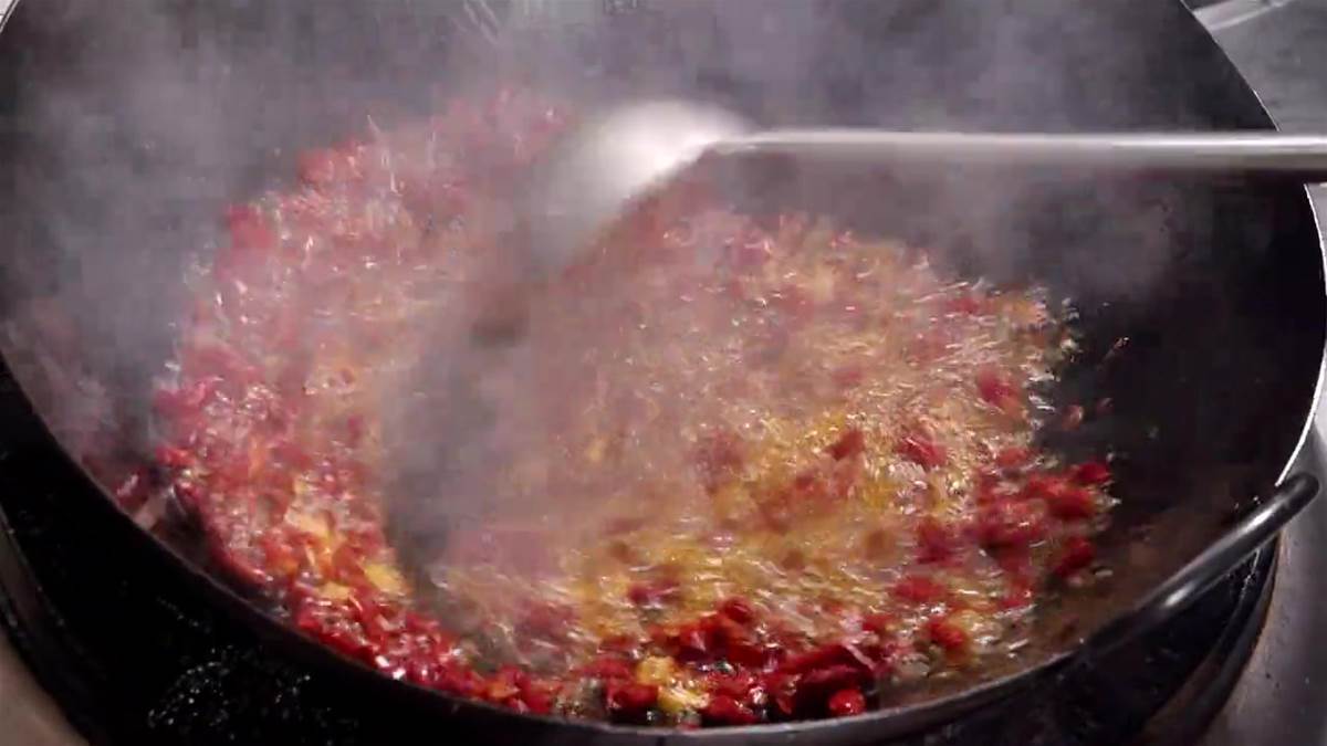 之后,調整鍋中油溫,加入菜籽油、姜蒜顆粒、青紅花椒,少量豆瓣醬,翻炒出香味后加入香辣醬和香菇,炒勻。
