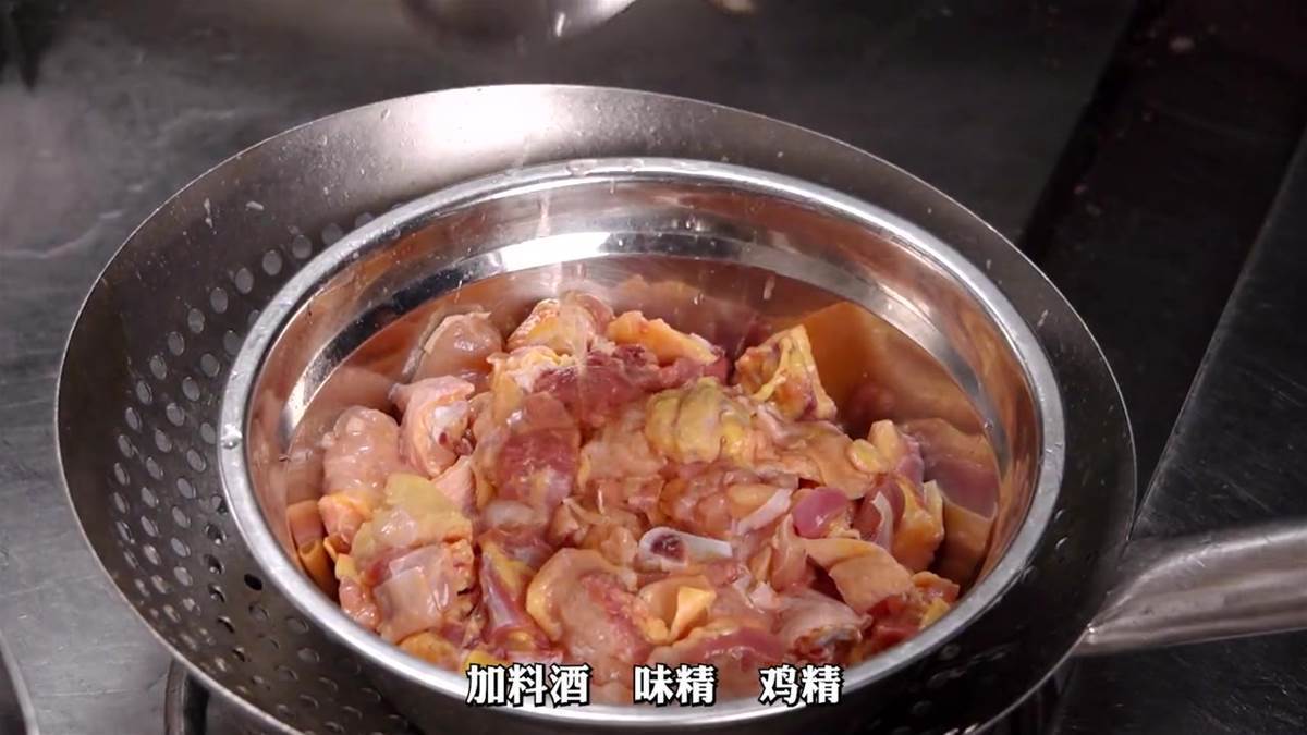 然后,清洗雞肉。用清水將雞肉洗凈去血水,擠干水分后加入料酒、味精、雞精和生抽腌制片刻。