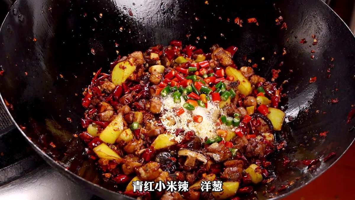 再下入雞肉炒香,加入炸好的土豆翻炒,適量辣椒面提色,最后加入十三香、孜然粉、雞精、味精、白糖、青紅小米辣、洋蔥、料酒等調味料翻炒均勻。