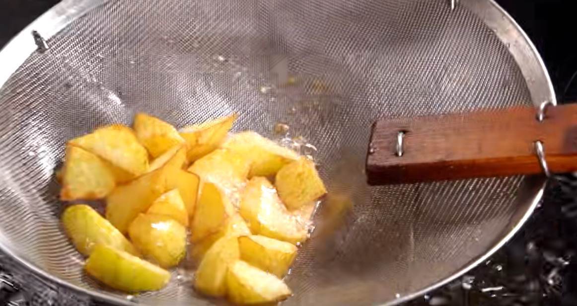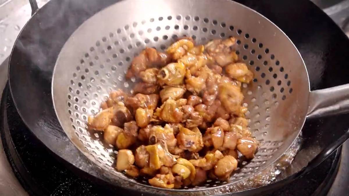 接下來,開始烹飪。起鍋燒油,將土豆下鍋炸至兩面金黃,撈出備用。4成熱油溫下入雞肉,快速翻炒至底部成型,撈出備用。