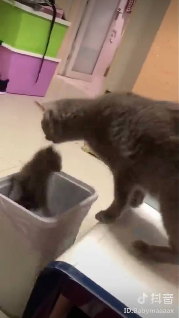 其實這隻貓媽媽不是要棄貓,只是覺得狹窄的垃圾桶比較安全,所以想讓小貓待在裡面。不能怪牠啦~