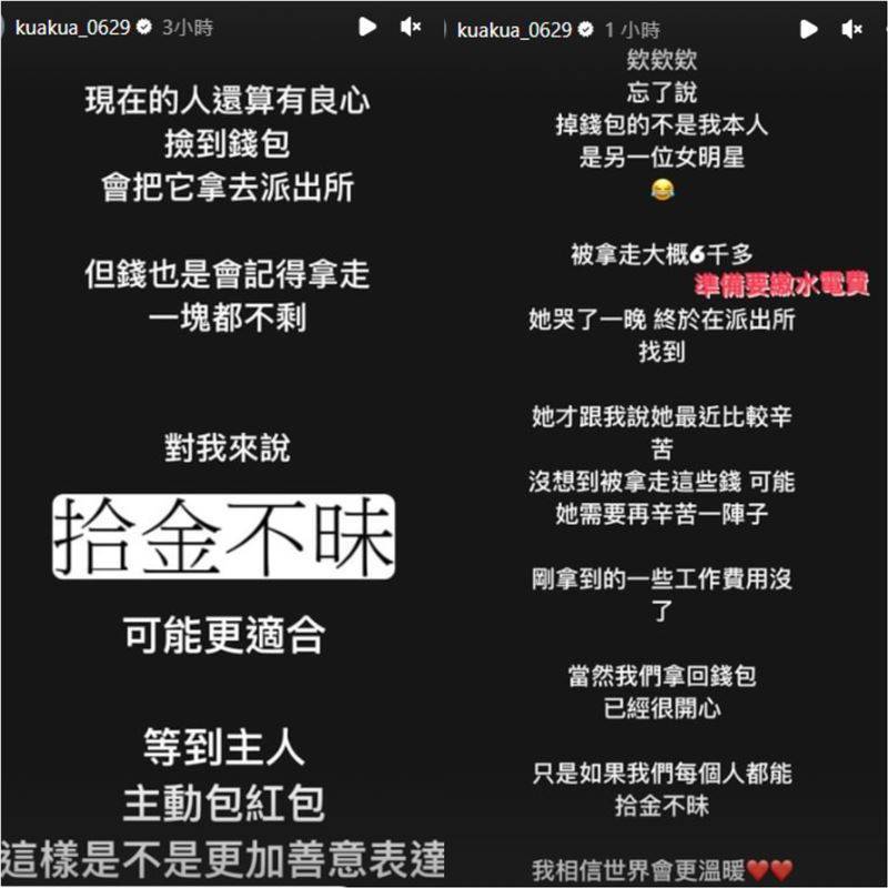 嘻小瓜在Instagram發文透露,一名女星弄丟錢包,為此哭了一整晚,後來終于在派出所找到錢包,裡面要繳水電費的6000多元卻早已被拿走,「她才跟我說她最近比較辛苦,沒想到被拿走這些人,可能她需要再辛苦一陣子」。