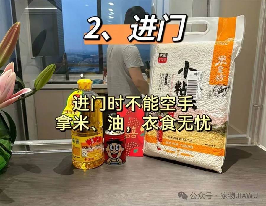 進家門的時候,通常不建議空著手,最起碼拿一些米面油之類的糧食,或者從家里把還要穿的衣服(最好是新衣服)拿到家里,總算也是沾了沾衣食無憂的感覺。