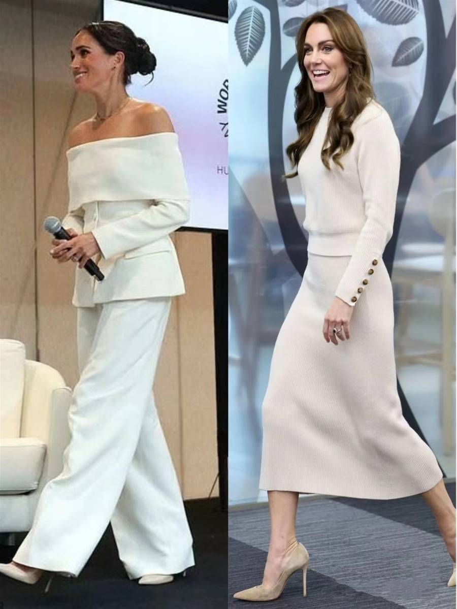 不過梅根王妃和凱特王妃參加的不是在一個國家,可是兩人穿的衣服卻很相同,都是淺色系的套裝,高跟鞋也是驚人的相似,還有很多網友感嘆凱特和梅根太默契了,也有網友表示凱特王妃不穿西裝比梅根王妃還要有女人味。