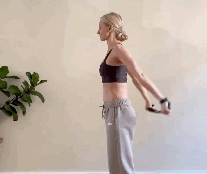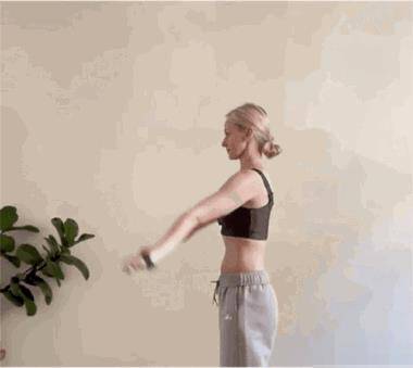 呼氣,雙手臂彈動向后打開胸腔