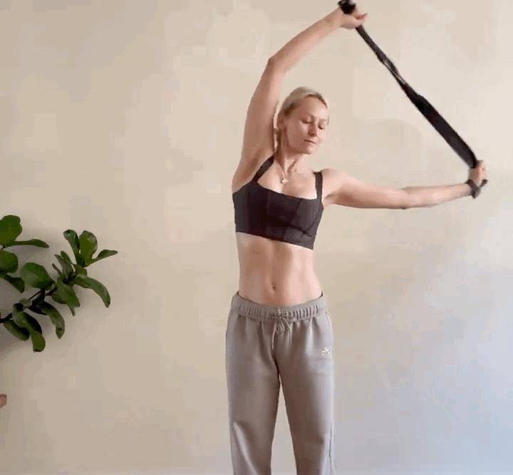 呼氣,雙肩帶領伸展帶向右肩打開