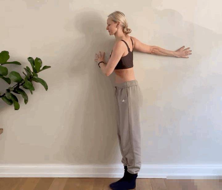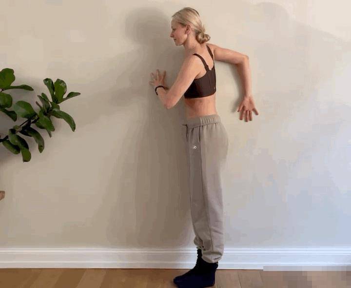 側面對墻面站立,右手屈手肘推墻