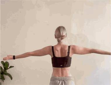站立,雙手側平舉 左大臂內旋向后放在后背上 手指盡量向上找頭頸 右大臂外旋上舉到頭頂 屈小臂,雙手互抓,扣在一起