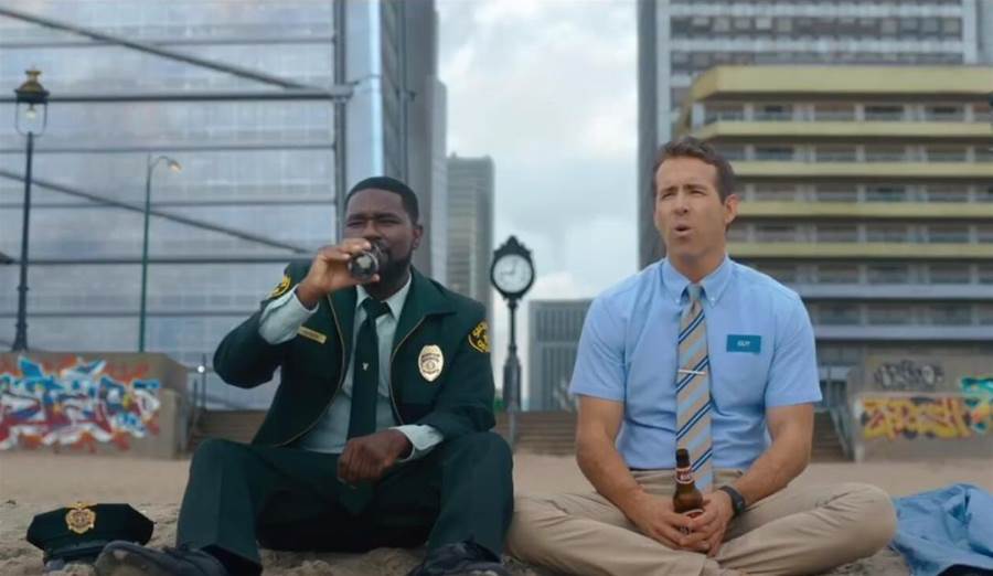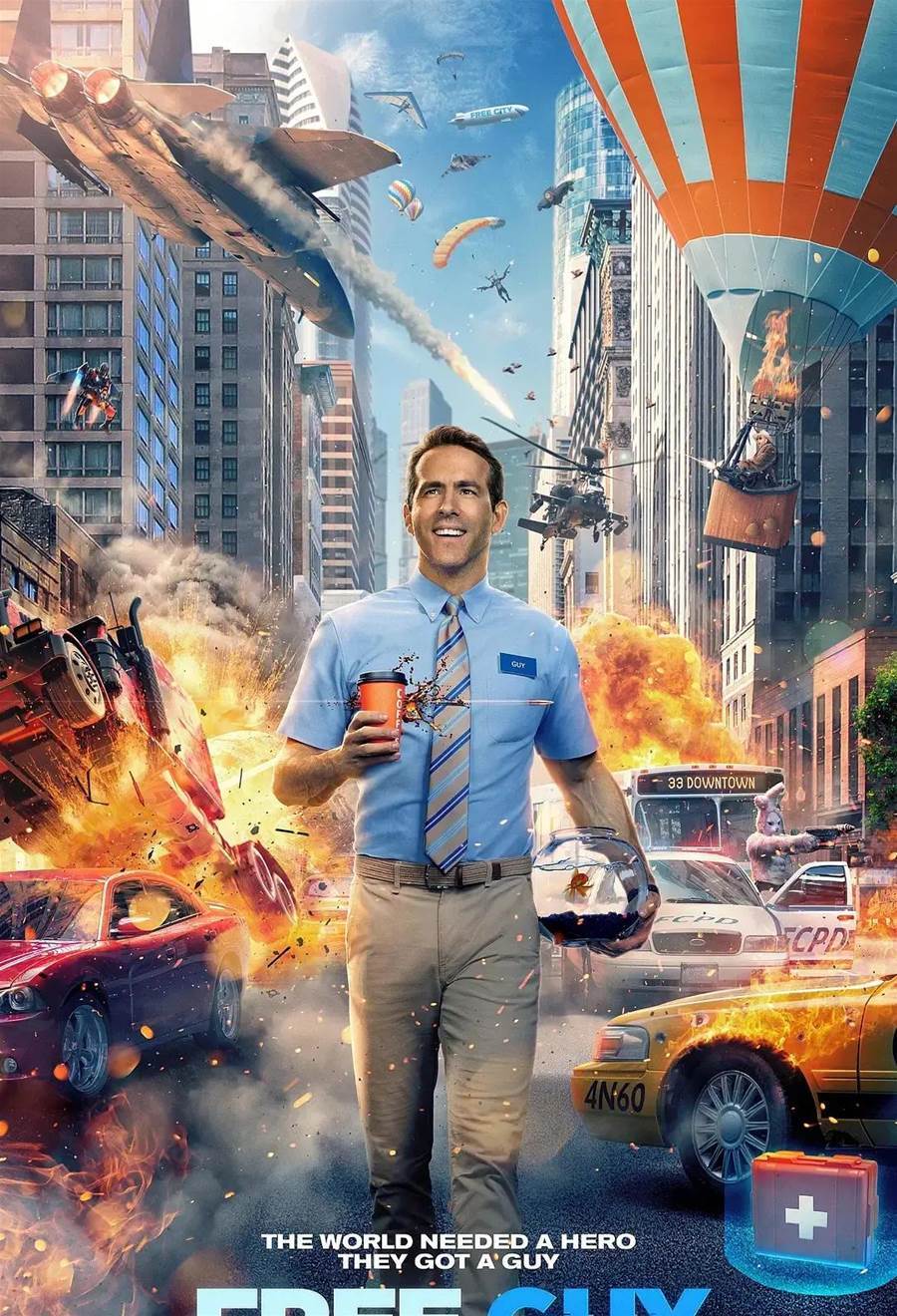 《失控玩家》講述一位孤獨的銀行柜員發現自己其實是大型電游的背景人物后,揭露游戲廠商老闆的陰謀,拯救所處的游戲世界的故事。海報設計風格充滿了美國大片元素,如城市摧毀、汽車燃燒、降落傘英雄等標志性特征。
