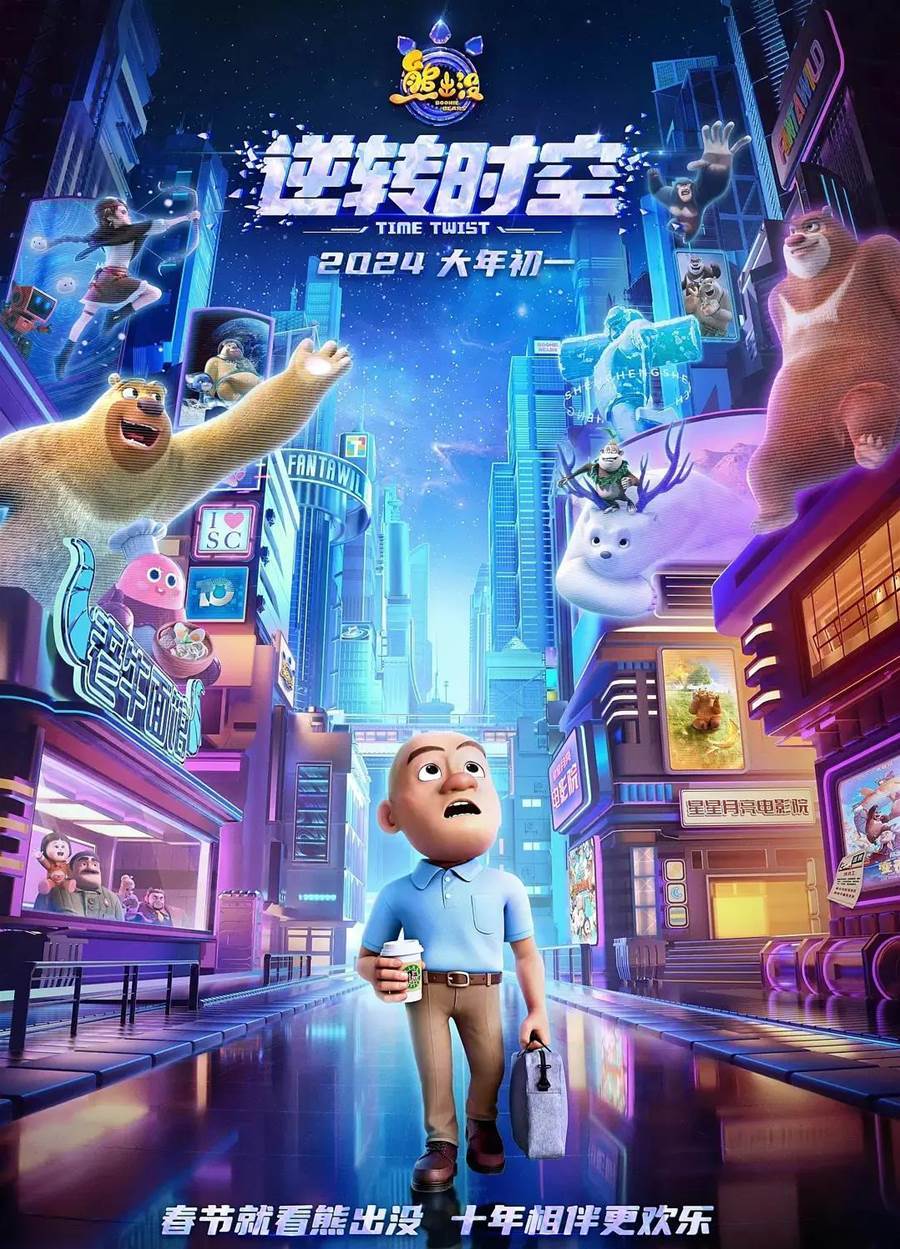 《熊出沒逆轉時空》是該系列第十部影片,光頭強被設定成普通程序員,他時常做夢夢見森林和兩頭狗熊,在一次外出訪問客戶的途中想起了森林小導游的身份,得到一次重新選擇人生的機會,為了挽救舊時間線中的熊大熊二,開啟了一場奇妙時空冒險。因此,海報設計充滿了夢幻色彩,虛擬感強。