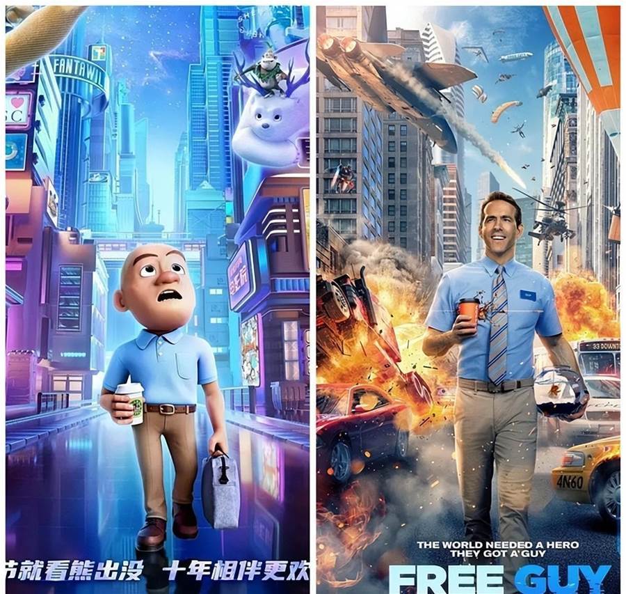 看敘事結構,兩張海報并不相像,但這并不能完全排除兩者的相似性。《熊出沒》與《失控玩家》都是中軸線構圖,設定場景也都是城市背景,再加上主人公的服裝配色及肢體動作,難免惹人懷疑。