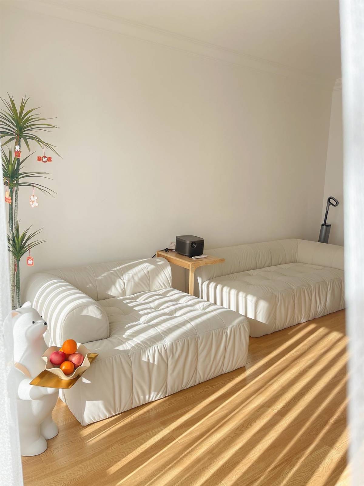 傢俱以白色和木色為主,再搭配全屋通鋪的原木色地板,整體效果很溫馨,尤其是屋外的陽光照進廳內,真的很治愈。白色的方塊布藝沙發可以自由組合,投影儀的主機正好可以放在沙發中間的小邊幾上,不占用太多空間。