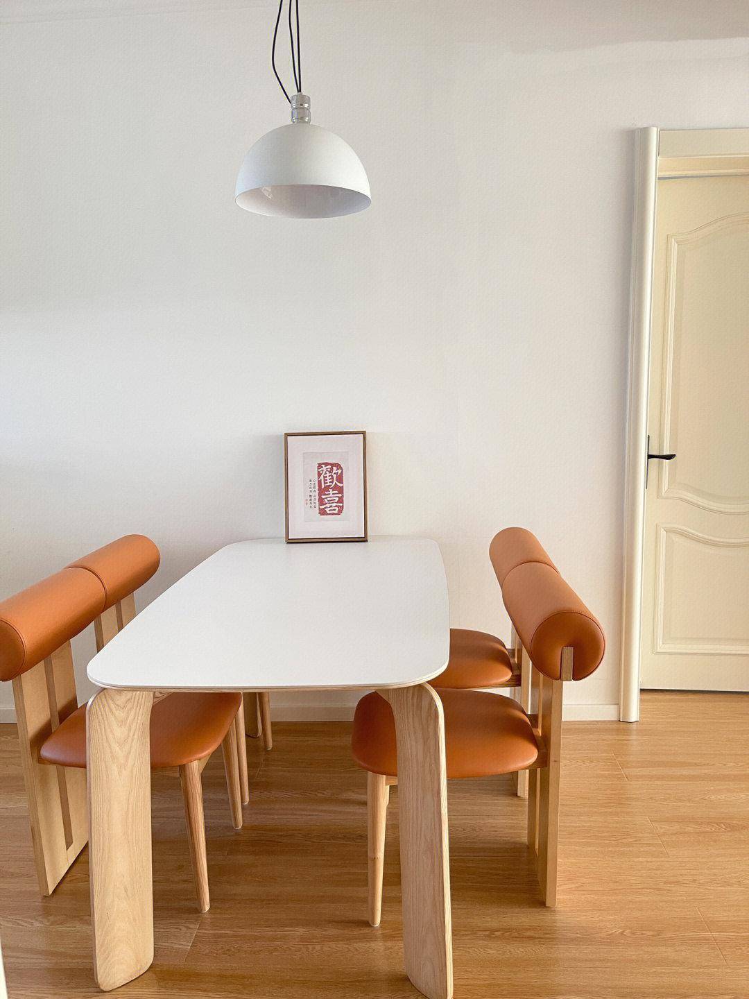 餐廳區也收拾得非常干凈利落,沒有一絲雜物,餐桌椅組合套裝的設計也非常有藝術性,而且暖色的搭配讓人感覺很溫馨。