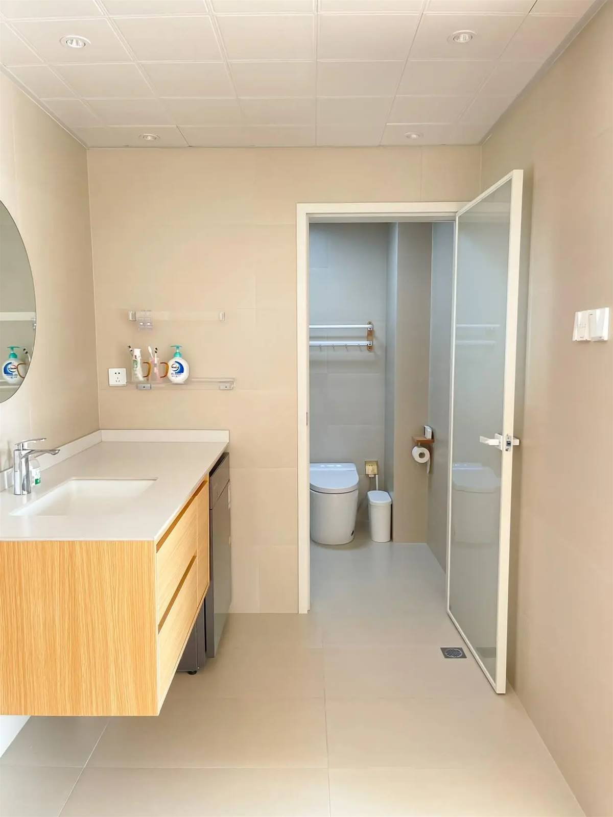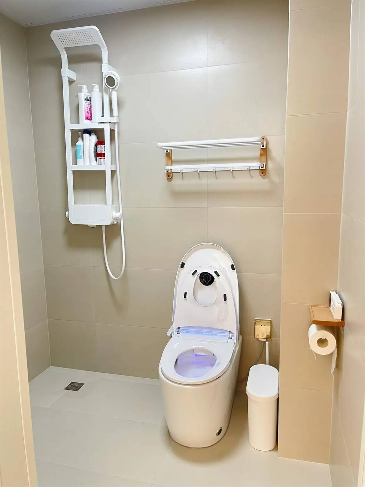 衛生間里面收拾得很干凈,淺黃色的瓷磚給人感覺比較溫暖,智能馬桶、沐浴架等配置都應有盡有。