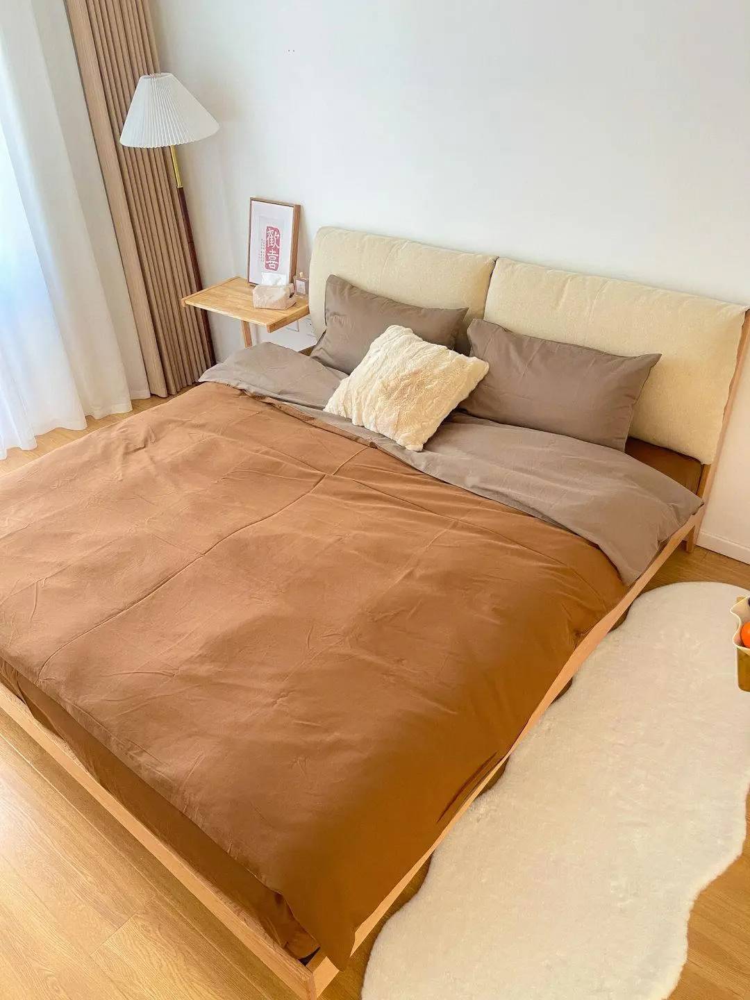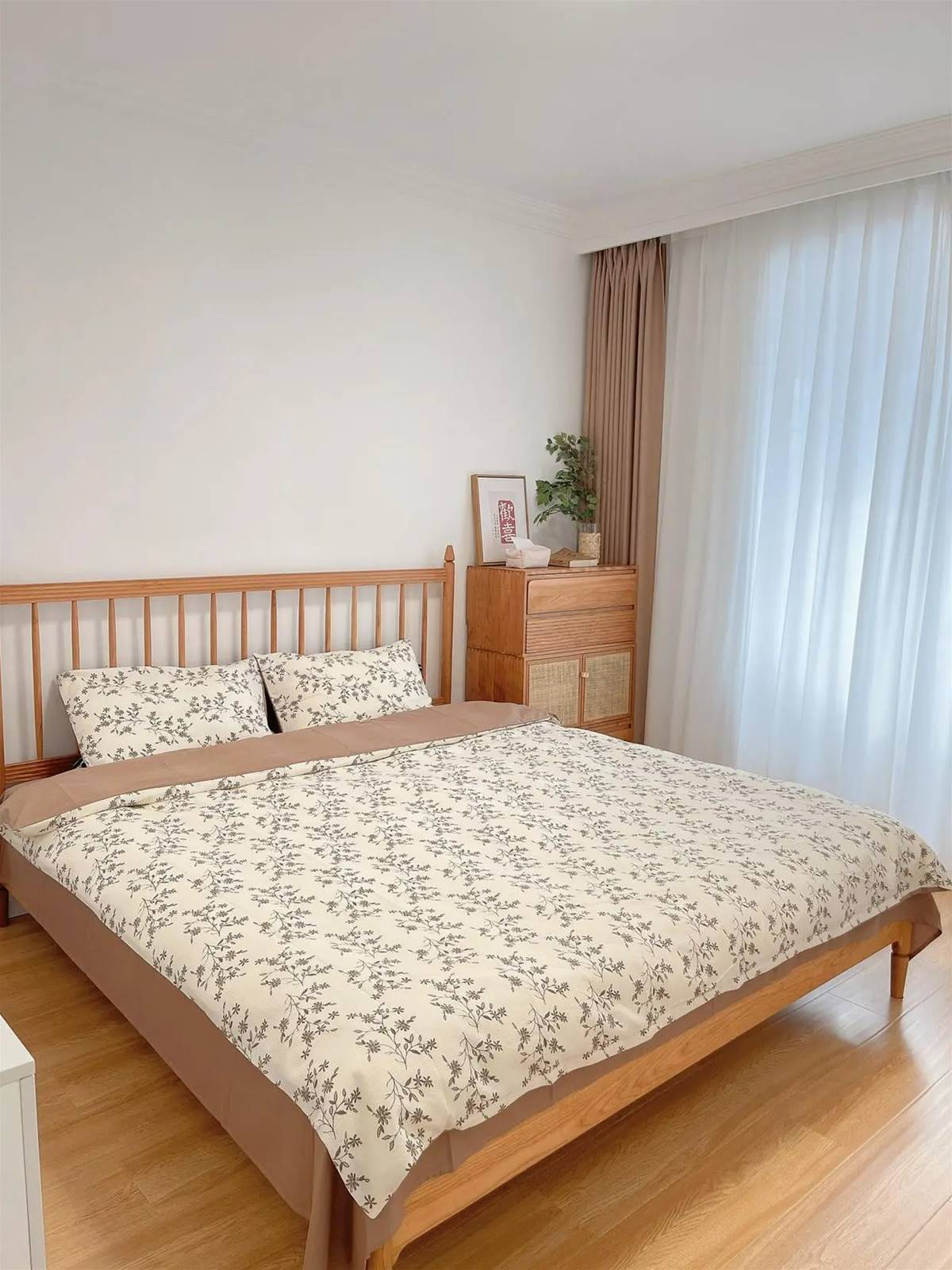 臥室的傢俱也采用同色系的原木風,包括大床和床頭柜,白色的窗紗再搭配素雅的床品四件套,一切都顯得那麼溫馨舒適。值得一提的是,屋主都是選用高腳的傢俱,方便掃地機器人鉆進去打掃,避免了衛生死角。