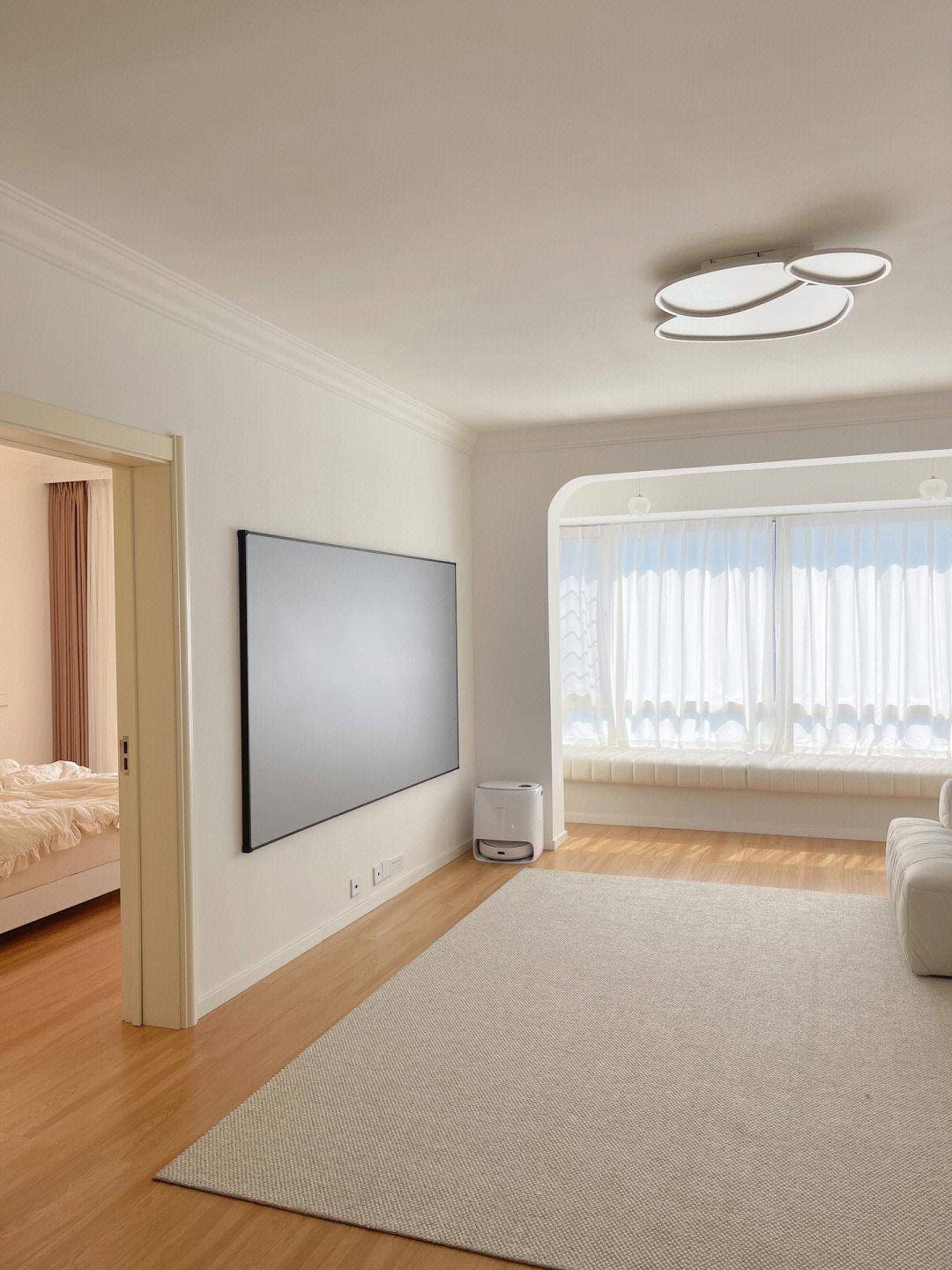 從客廳我們可以看出,總體上就是全屋大白墻+原木搭配,全屋通鋪地板,也沒有做復雜的吊頂和背景墻,但完工的效果真的讓人感覺很舒適!將陽台與客廳打通,同時舍棄了傳統的電視機和茶幾,使用投影儀代替,空間顯得寬敞又明亮。