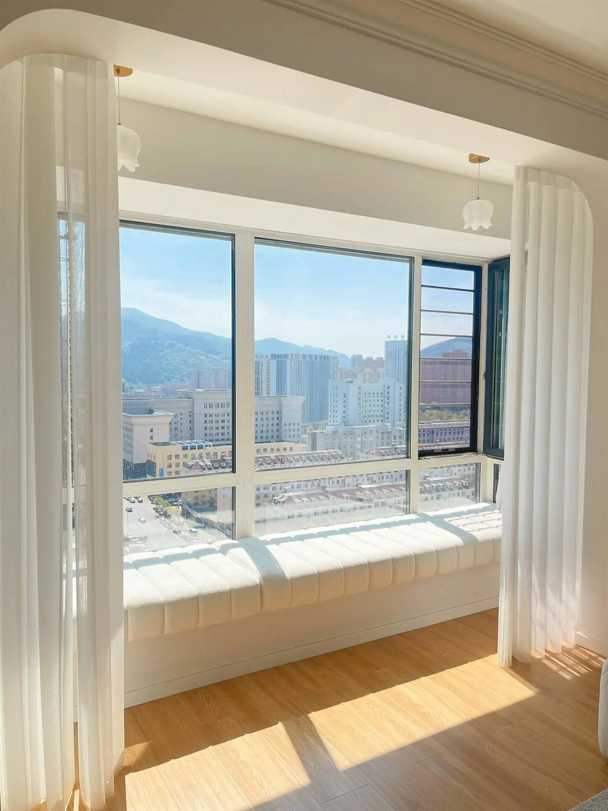 陽台與客廳打通,屋主還貼心得沿著窗台定制了淺色的坐墊,大面積的玻璃窗既能保持通透的視野,又能更充分的享受室外的陽光。由于全屋都有暖氣,也不用擔心冬天會太冷。