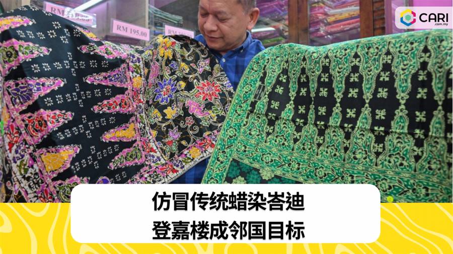 登嘉樓蠟染峇迪商會會長Shafei Ghazali 展示了一塊標簽為登嘉樓蠟染峇迪的泰國產沙龍布。