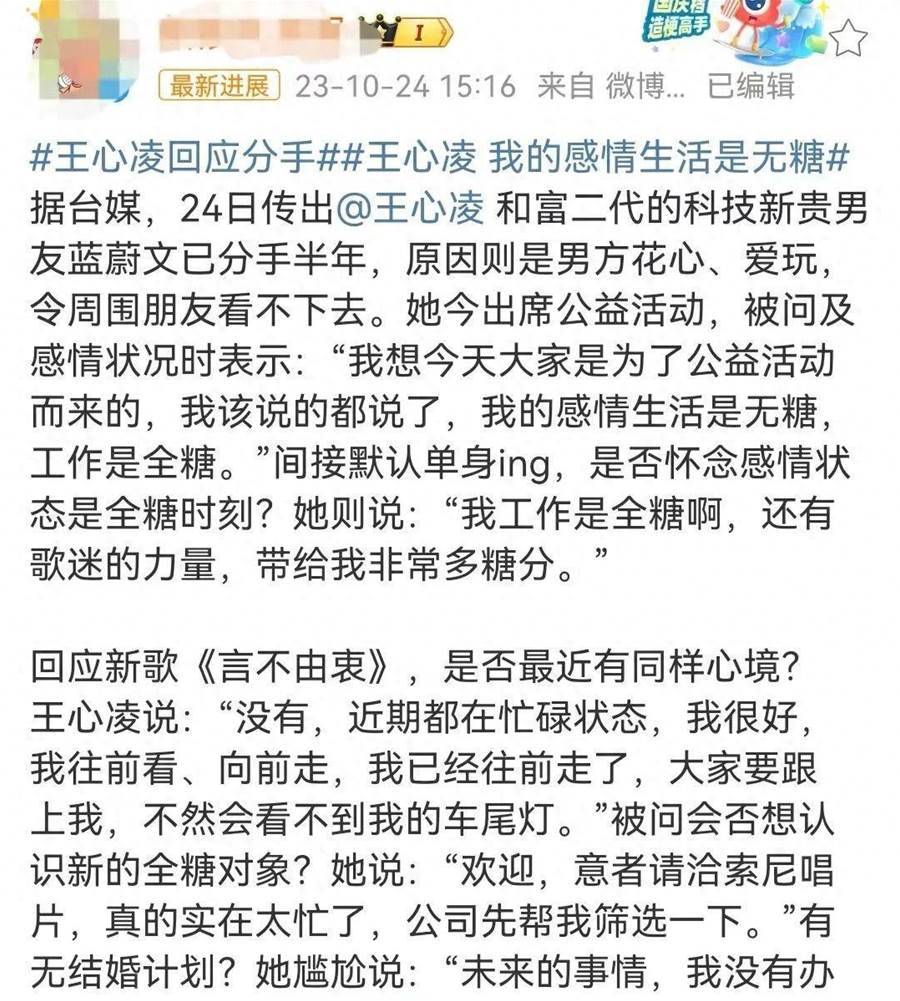 正巧王心凌今日現身參加公益活動,免不了接受記者的采訪,她表示自己的感情生活是「無糖」的,而工作卻是「全糖」的,間接委婉地暗示了自己目前已經分手。