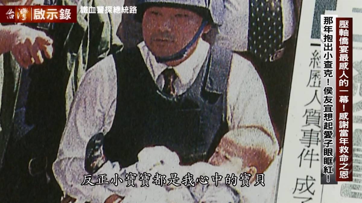 侯友宜從挾持事件中順利救出小查克,而自己的人生中卻救不回親生子。主持人接著提起31年前幼兒園火燒車,問道:「你心裡想到的是乃維(侯友宜兒子)嗎?」憶及獨子命喪身火窟,侯友宜表示「反正小寶寶都是我心中的寶貝」,曾經走過那段歲月,知道孩子是我們人生中的希望,所以當他把小查克抱出來時,心裡總算鬆一口氣。