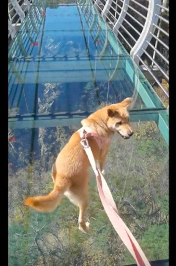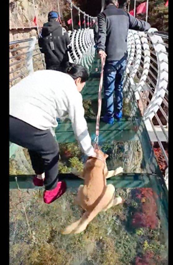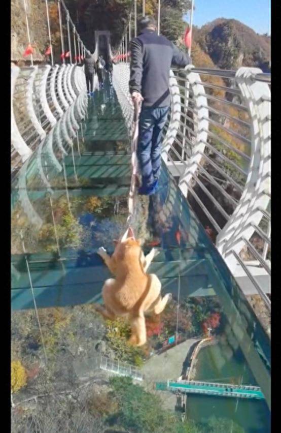 10月19日在遼寧大連,有一位網友家里養了只狗狗,這天全家出游去玩,而在景點里就有個玻璃棧道呢!大家都很樂呵呵的上去了,沒想到家里的狗狗剛站上去,就被嚇趴了,怎麼都不愿意往前走!當時也沒有回頭路,主人只能是一邊安慰狗狗,一邊硬拉著狗狗往前走!