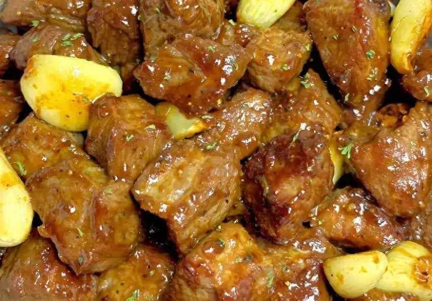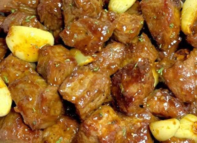 3、鍋留底油,放入牛肉粒煎一下,煎熟后放入蒜粒,加入生抽、蠔油、胡椒粉,翻炒均勻炒至入味。