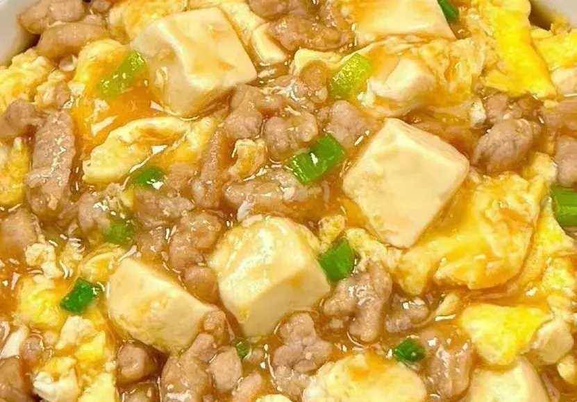 5、再次起鍋燒油,油熱后放入嫩豆腐雞蛋液煎一下,煎至稍微凝固后倒入醬汁和肉末,用鍋鏟輕輕地滑動,煮至醬汁濃稠,撒上蔥花點綴即可出鍋裝盤開吃。