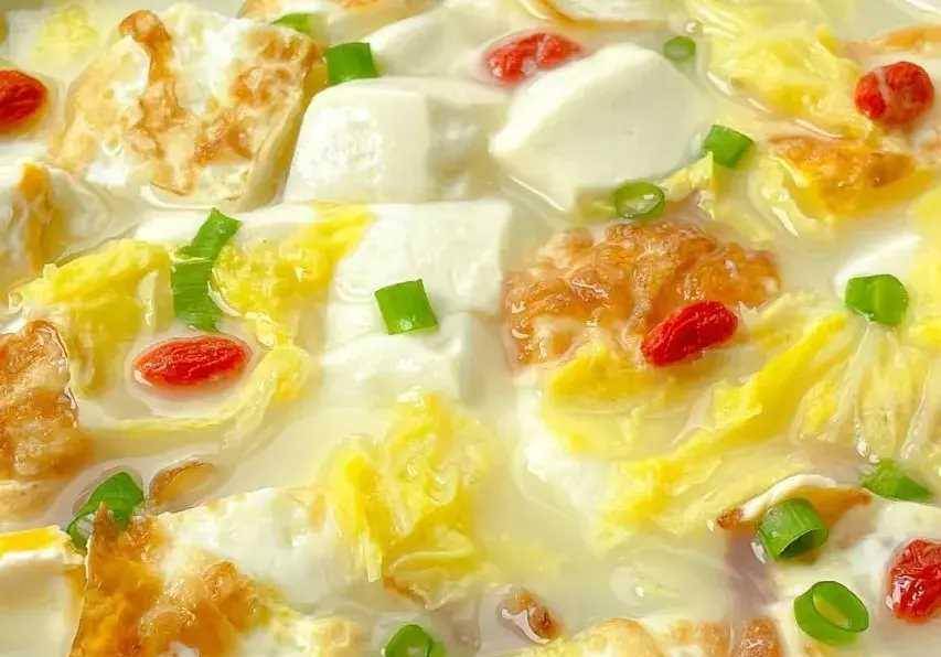 3、再放入嫩豆腐煮至湯水奶白,然后放入白菜煮熟,最后加入食鹽調味,撒上枸杞子即可出鍋開吃。
