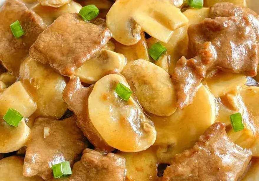 4、起鍋燒油,油熱后放入蒜片炒香,再放入牛肉翻炒均勻,炒至變色后放入口蘑,加入醬油和水淀粉,快速翻炒均勻,炒至入味即可出鍋裝盤開吃。
